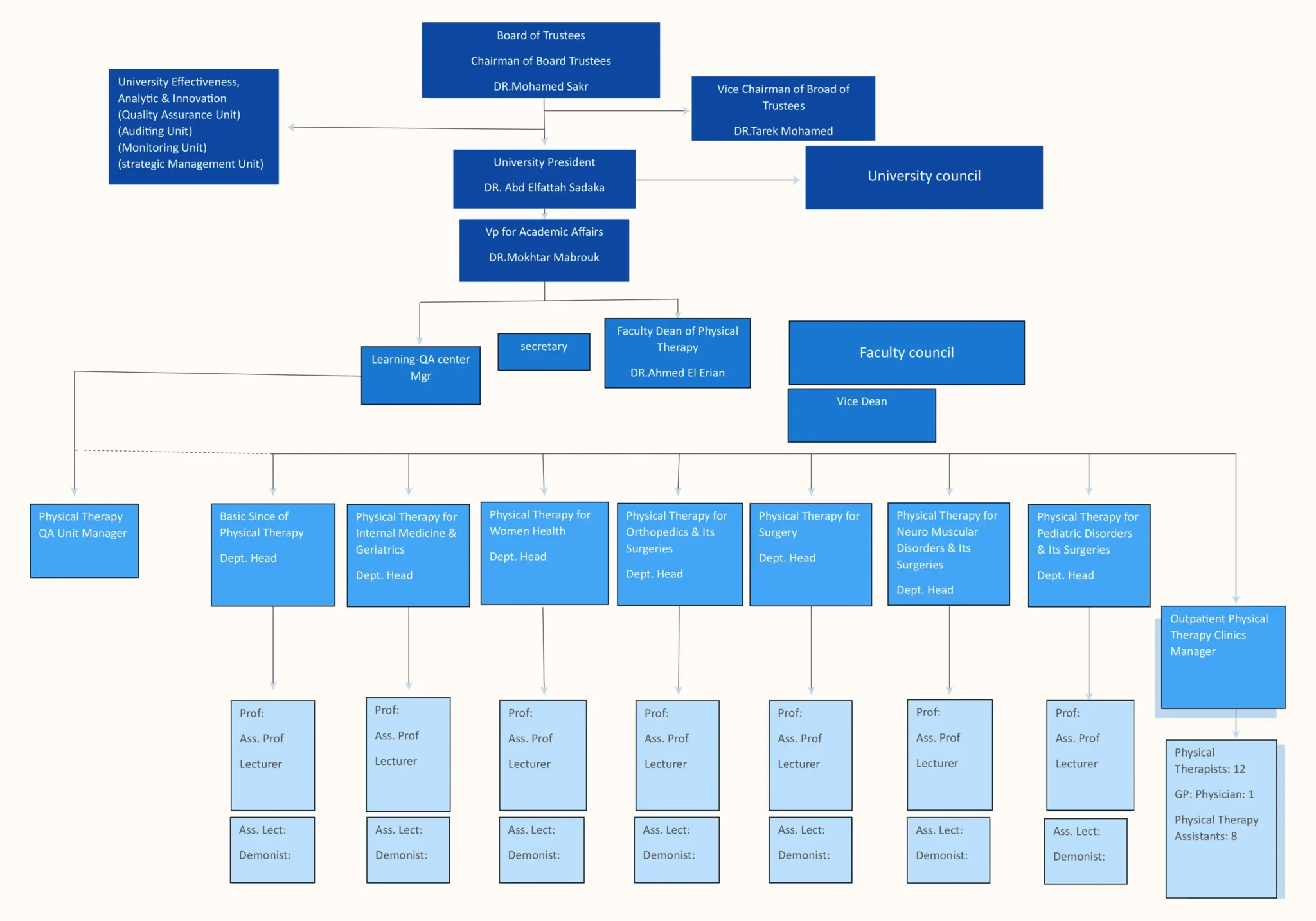 The Core values governing the activities and relationships of the Faculty of Physical Therapy – Al-Salam University form the foundation on which the faculty’s performance is based in order to achieve its vision, mission, purpose, and strategic objectives. It is essential to consult with leaders, faculty members, teaching assistants, administrative staff, and students. The values adopted by the Faculty of Physical Therapy are also derived from the principles and values of Al-Salam University, as follows: