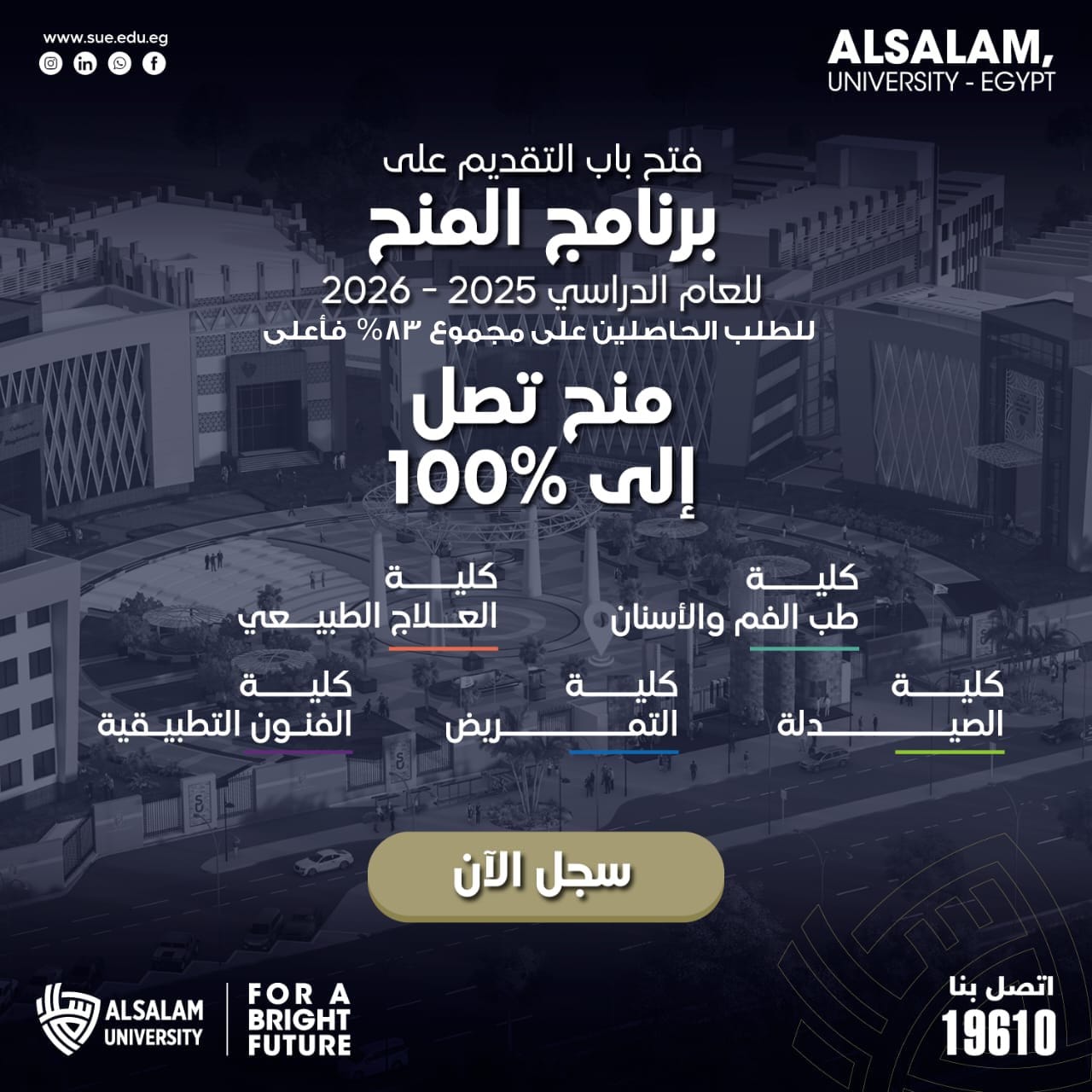 وعلى الطلاب الحاصلين على مجموع 83% فأعلى والراغبين في التقديم ببرنامج المنح الدراسية بجامعة السلام، فيُرجى استكمال البيانات في الإستمارة التالية: https://forms.cloud.microsoft/r/5te0npatPL
