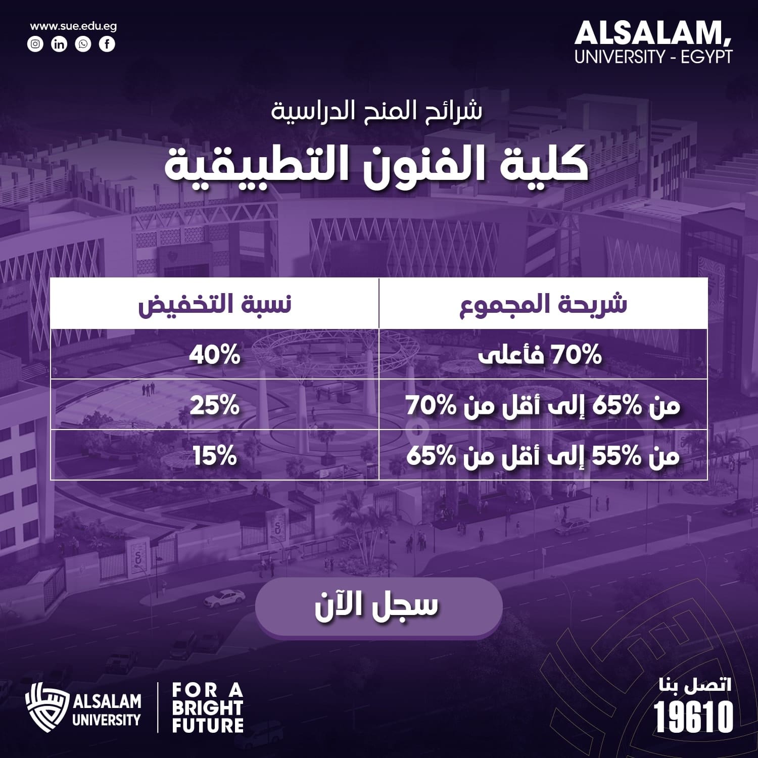 تُعلن جامعة السلام عن توافر عدد محدود من المنح الدراسية بكلية الفنون التطبيقية لجميع شعب الثانوية العامة (علمي علوم – علمي رياضة – أدبي) للعام الجامعي 2025–2026،