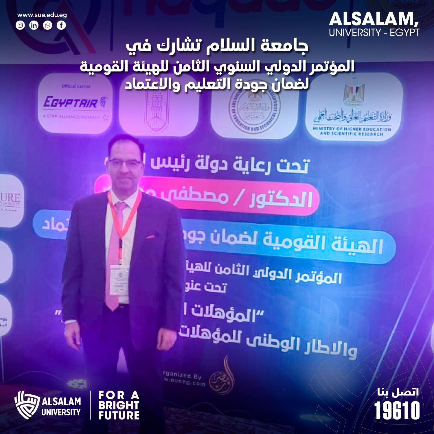 في إطار التزامها المستمر بتطوير منظومة الجودة الأكاديمية ومواكبة التحولات العالمية في التعليم العالي، شاركت جامعة السلام في فعاليات المؤتمر الدولي الثامن للهيئة القومية لضمان جودة التعليم والاعتماد (NAQAAE)، والذي عُقد تحت عنوان: